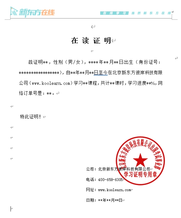 只要您是新东方在线的学员,并有正在学习的课程,听课时间超过1个月且听课进度达到50%以上,就可以开具在读