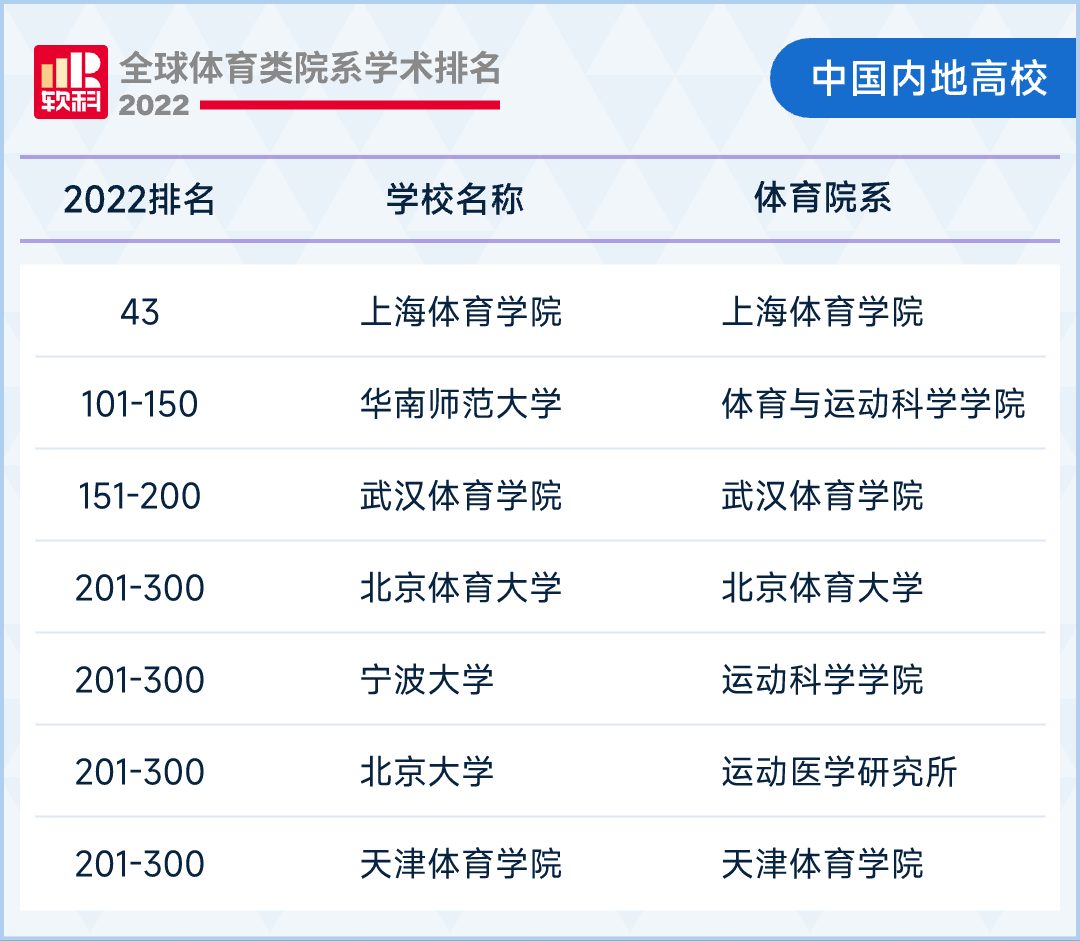 高等教育评价专业机构软科2022年12月8日正式发布"2022软科全球体育类院系学术排名",在全球300校排行中,我国内地共有7所高校上榜,上海体育学院首次跻身全球50强,再次成为国内世界排名最高的体育类院系。