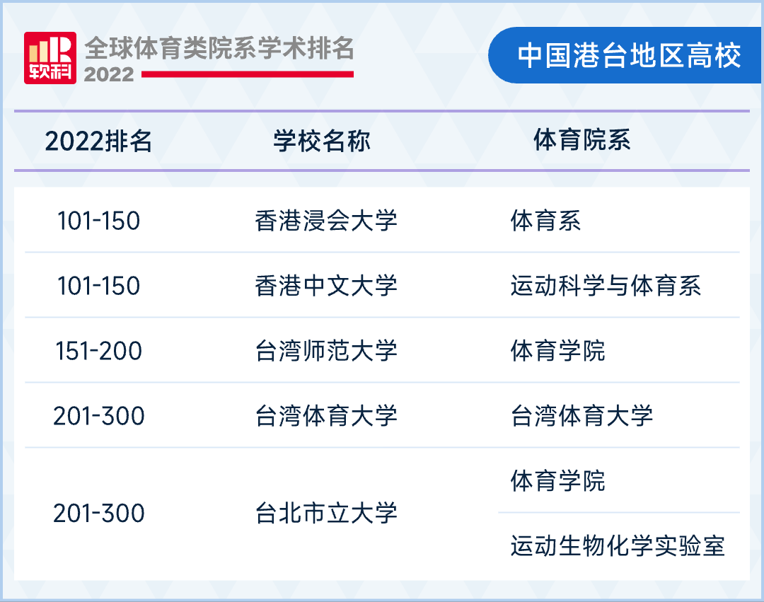 此外,我国港台地区共有5所高校上榜,香港浸会大学的体育系和香港中文大学的运动科学与体育系均排在世界第101-150名;台湾师范大学的体育学院排在世界第151-200名;台湾体育大学和台北市立大学的体育学院排在世界第201-300名。