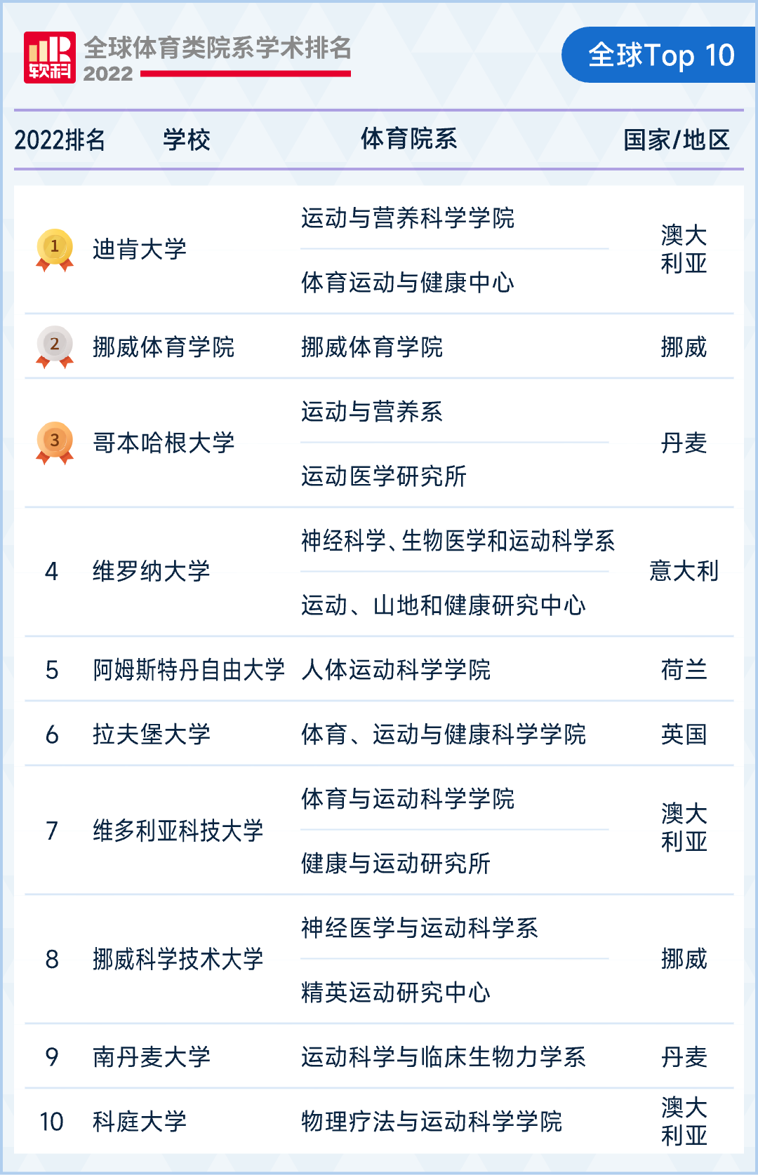 全球十强高校中,综合性大学的体育院系占据主导地位,专门类体育院校仅有排在第2名的挪威体育学院。挪威的挪威科学技术大学和澳大利亚的科廷大学首次晋级十强。