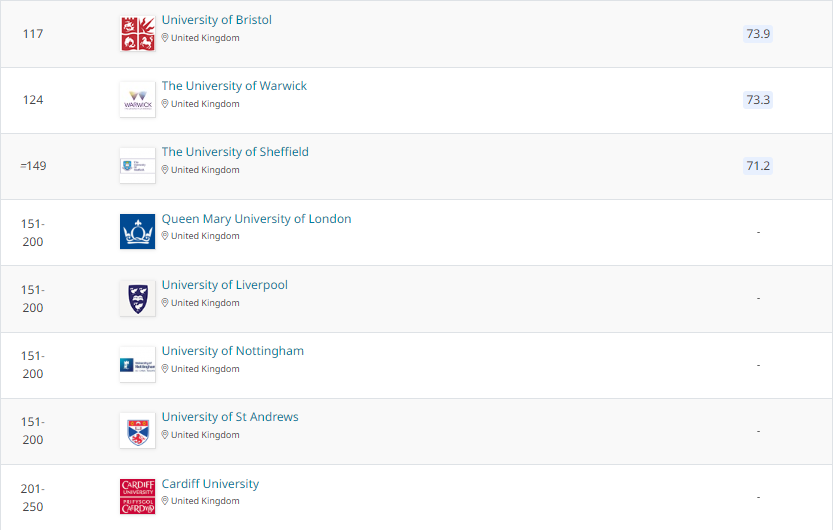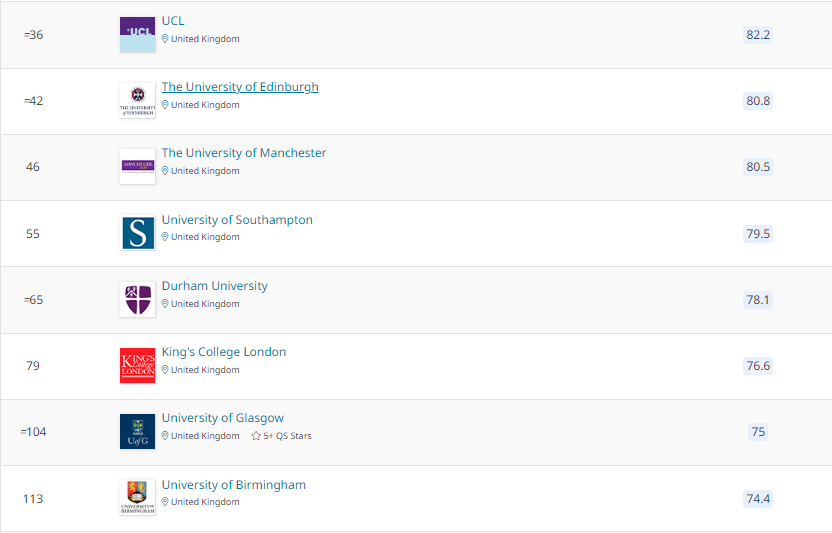 在最新的2022年QS物理&天文学专业排名中,英国院校榜单如下: