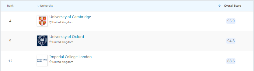 恭喜上榜的39所英国院校!其中,剑桥大学(4)、牛津大学(5)进入世界前十!另外,更有9所大学位居榜单前百!