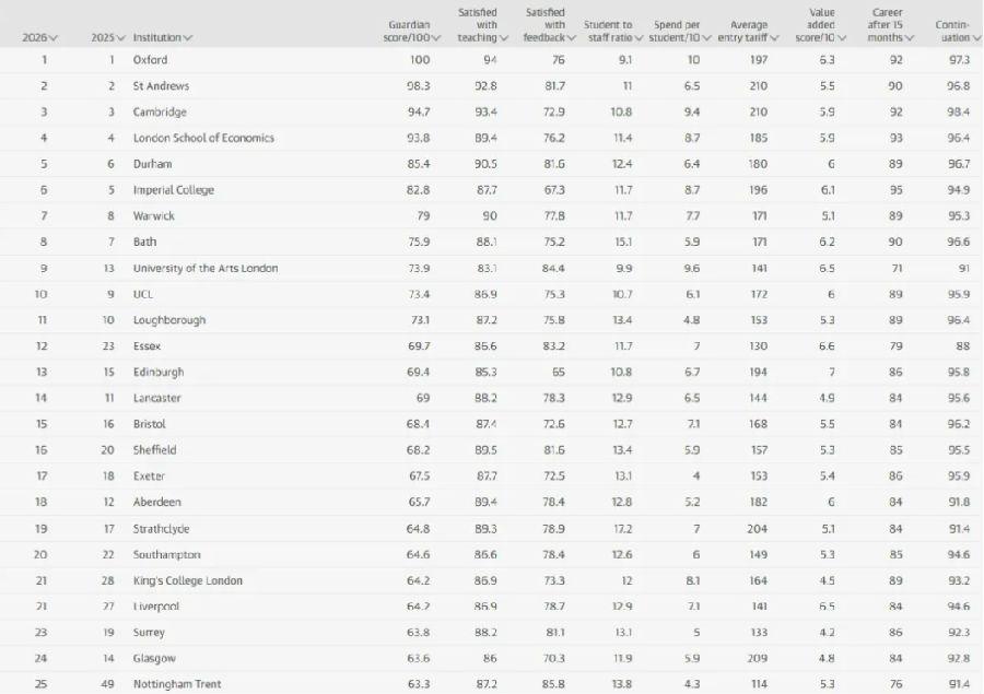 英国留学风向标已更新!2026卫报大学排名重磅发布,牛津重夺榜首,圣安德鲁斯超越剑桥,黑马院校表现抢眼——你的梦校排名有何变化?