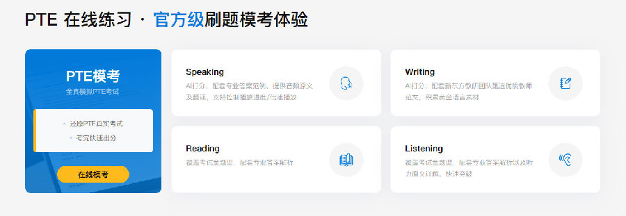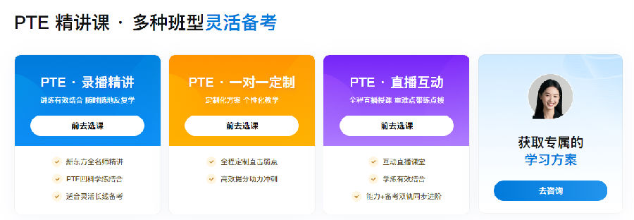 课程内容:查看课程是否涵盖了PTE所有题型,并且有详细的技巧讲解。新东方在线国际教育的PTE课程包括口语、写作、阅读和听力四个模块,共计20小时的题型技巧精讲和16小时的真题精讲强化。