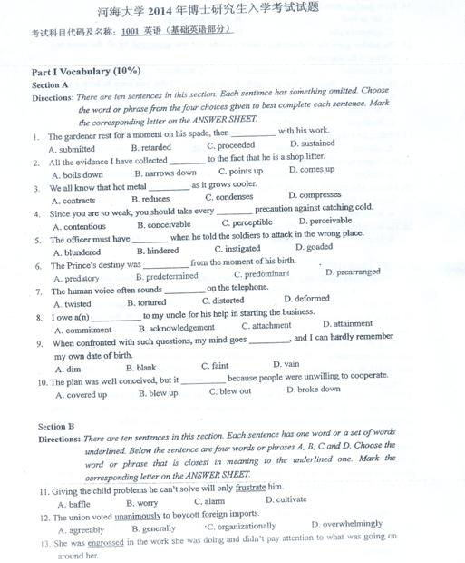新东方在线为2015年报考河海大学博士的考博考生整理了2014年河海大学考博英语真题,河海大学考博12月20日开始网报,请考生抓紧时间复习。