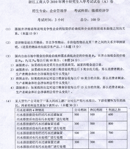 浙江工商大学2010年考博真题企业管理学专业:微观经济学