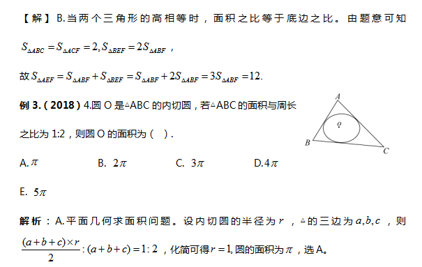 平面几何求面积几乎是每年必考内容,2018年出了2题面积类的题目。在学习平面几何这一章节中,一定牢记三角形、圆与扇形的相关面积公式,然后再去掌握一些做题的基本方法,即比例关系和割补法这两种方法。结合2018管理类联考的考试情况来看,考试方向上更明确,即注重对基础知识的理解,又注重对基础知识的灵活运用,真题的出题质量非常高,题目的区分度较高,考查学生的真实水平,所以对数学的学习,同学们决不能轻视。