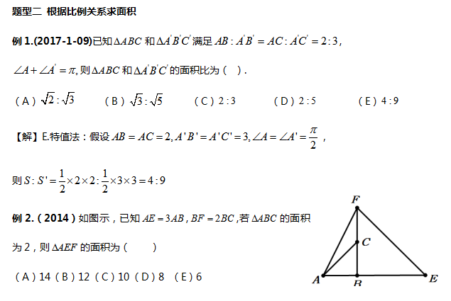 在平面几何中,大部分题型是求面积和求长度的问题。在求面积时,如果是不规则图形,就利用割补法化为求规则图形的面积,如果是规则图形,需要用相似比或者面积比求得图形的面积。下面给出重要的题型—根据比例关系求面积—的历年真题。