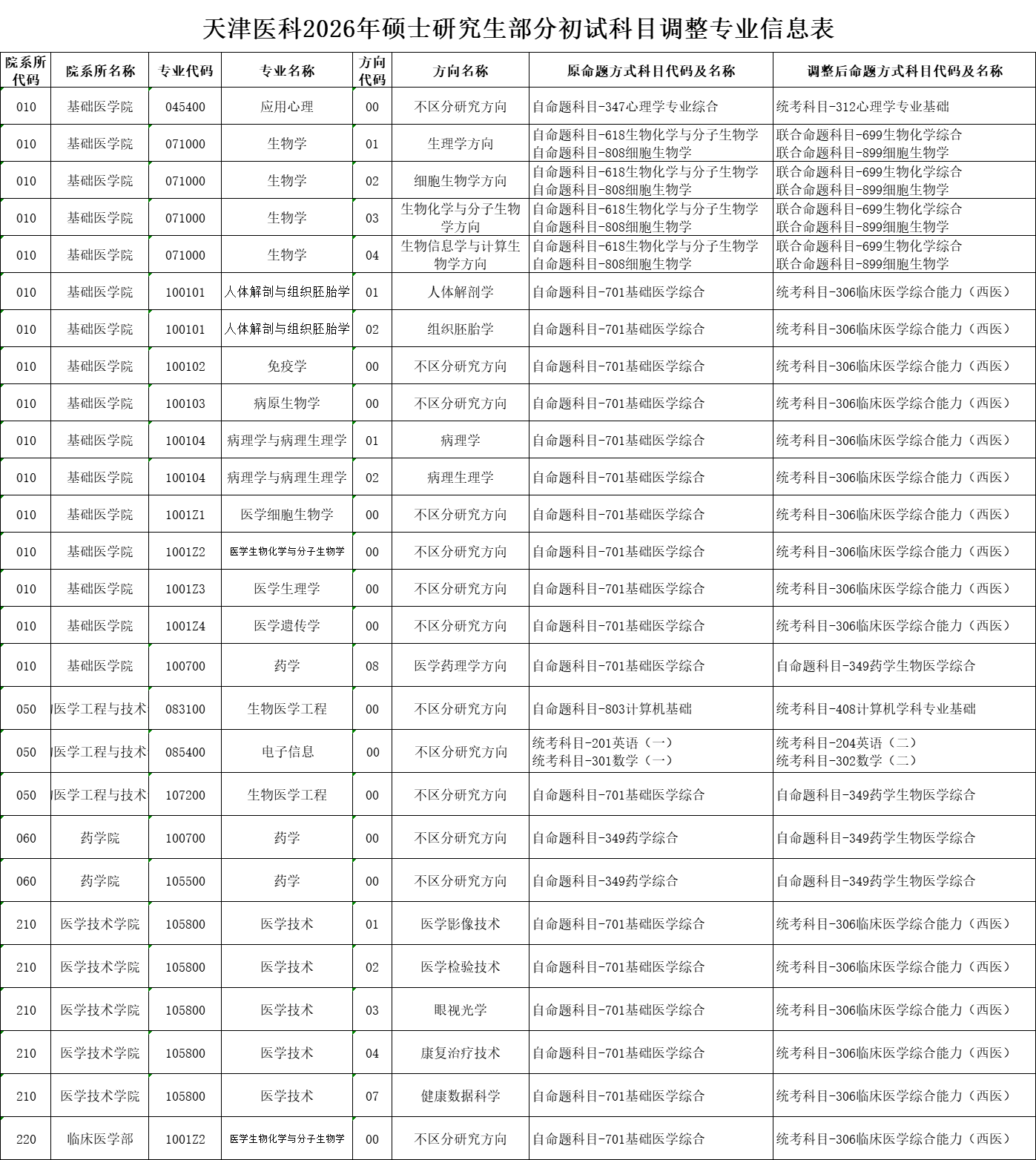 天津医科2026年硕士研究生部分初试科目调整专业信息表