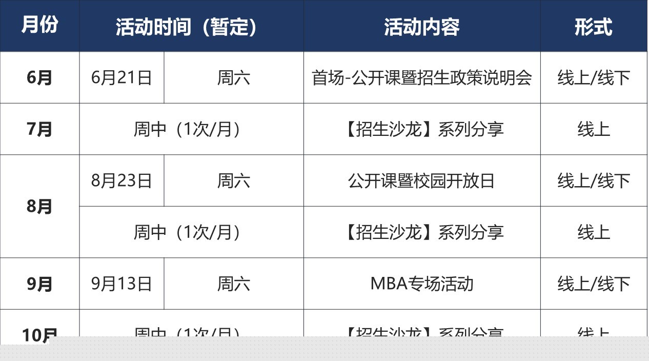 招生活动包括招生政策说明会、招生专场、招生沙龙等,考生可根据自身需要报名参加下列活动。