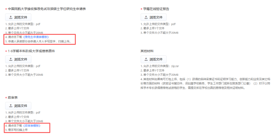 6.《中国民航大学接收推荐免试攻读硕士学位研究生政审表》(模板在中国民航大学研究生招生管理系统上传界面下载)。