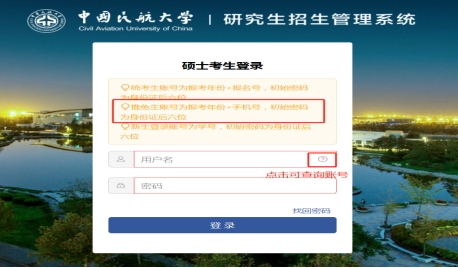 上述材料请在报名申请后,通过我校研究生招生管理系统(https://yjszs.cauc.edu.cn/)“硕士考生登录”界面在线提交,账号密码见登录界面。