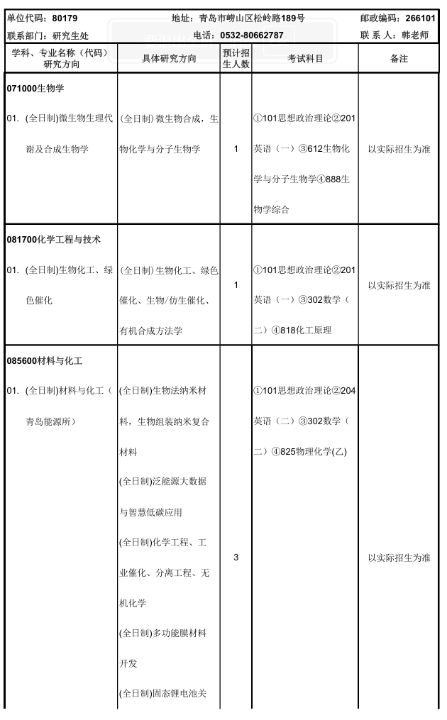 中国科学院青岛生物能源与过程研究所2026年研究生招生专业