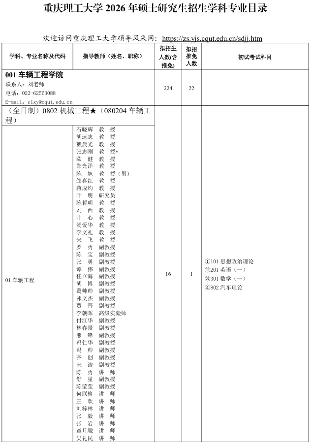 重庆理工大学2026年研究生招生专业目录