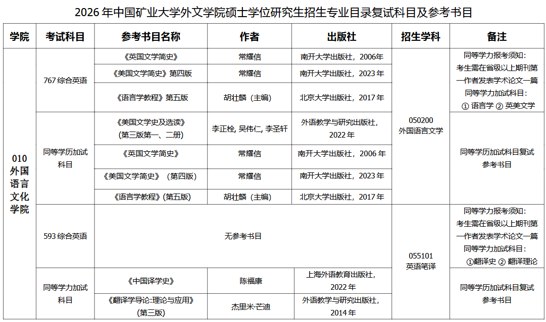 中国矿业大学外文学院2026年考研复试科目参考书目