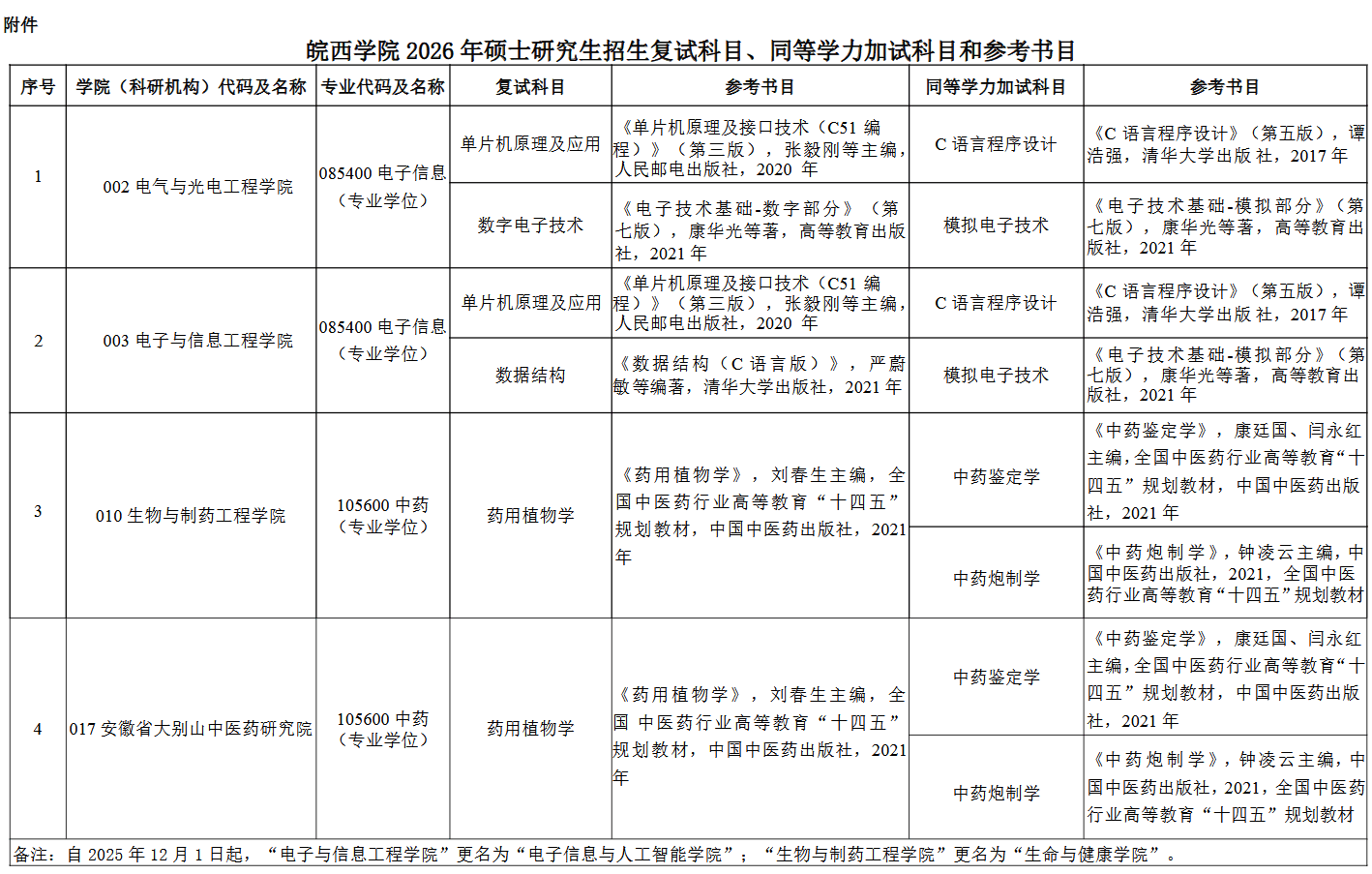 皖西学院2026年考研复试科目、同等学力加试科目和参考书目