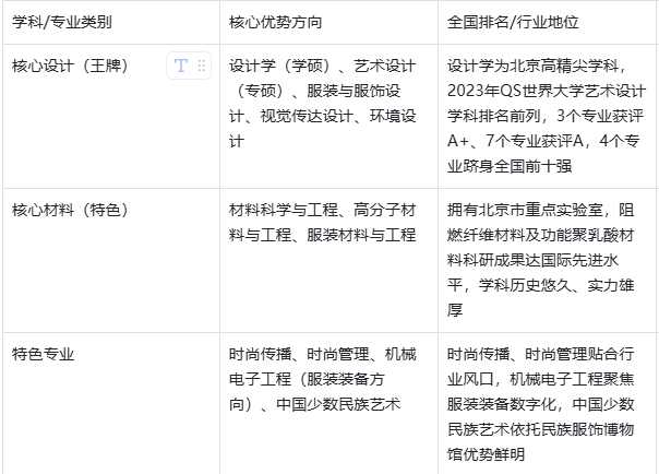 北京服装学院以“时尚设计”为核心,秉持“与美同行”的校训,形成“以艺为主,服装引领,艺工融合”的办学特色,是北京市高水平特色型大学,学科实力扎实,多个专业跻身全国前列,其中设计学为北京高校高精尖学科,在第五轮学科评估中排名前3%-7%,艺术设计在全国专业学位水平评估中排名前3%,依托北京市属资源,在时尚设计、服装服饰、材料研发等领域形成了独特优势,具体核心学科与优势如下: