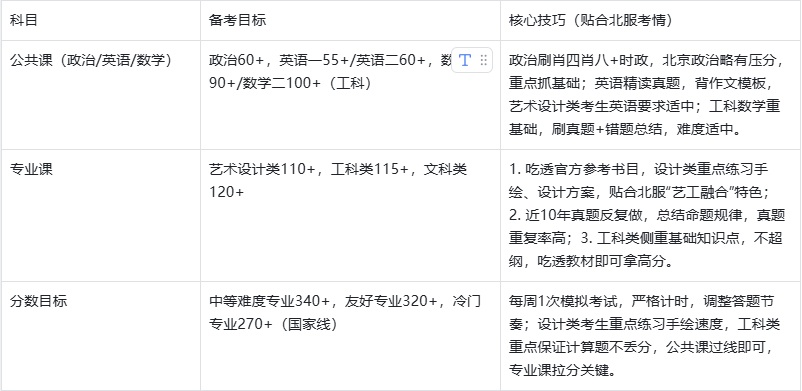 ❌ 不要忽视专业课练习(尤其设计类),北服设计类专业课注重创意与基础结合,需提前练习手绘、设计方案,避免临时抱佛脚;工科类专业课注重基础,吃透真题+教材即可拿高分。