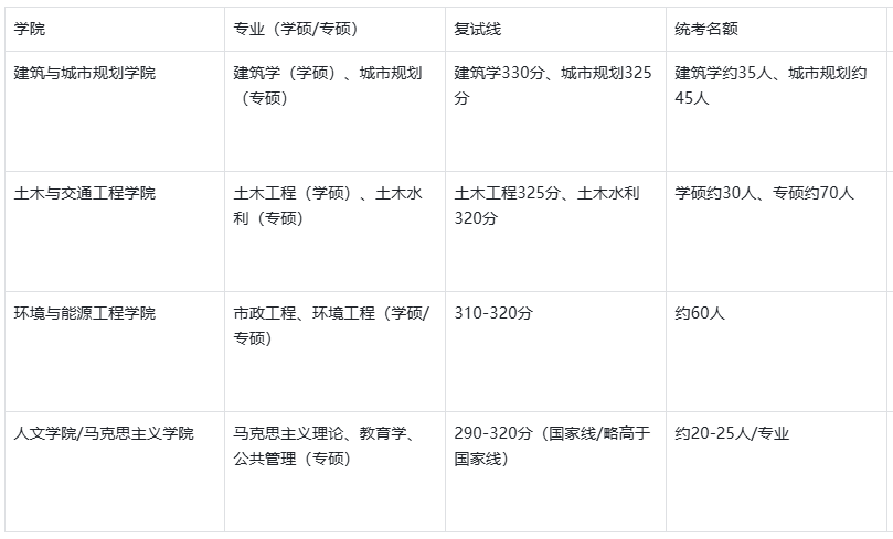 跨考适配:土木水利(接受土木、机械、水利跨考)、环境工程(接受化工、环境跨考)、公共管理(接受各类专业跨考),不限制跨考,复试友好,零基础跨考考生可优先选择冷门文科专业,有工科基础的跨考考生可选择土木、市政类专业。
