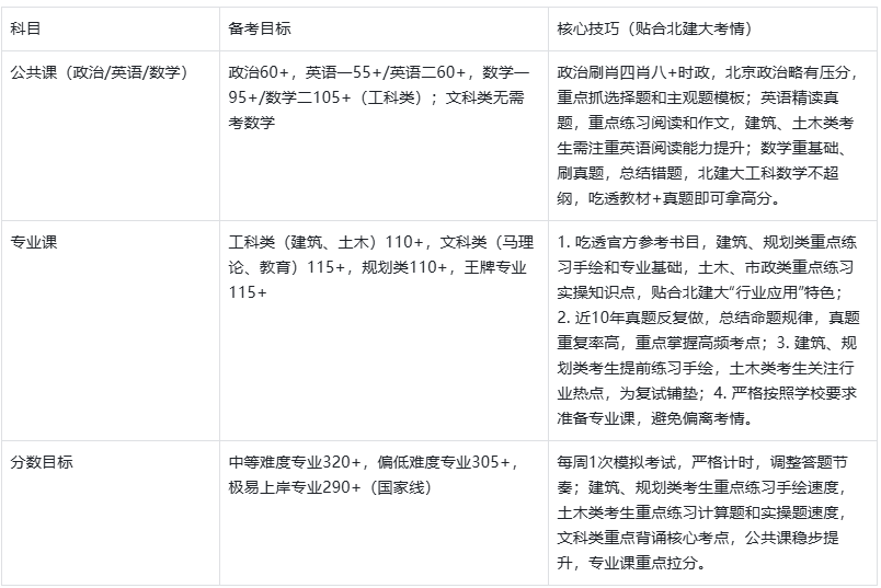 适配人群:本科双非/二本、专业基础中等,热爱建筑、土木、规划领域,备考时间充足,目标北京建筑、市政行业的考生;跨考考生(工科相关)需提前补基础。