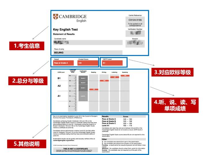 • 成绩低于 A2 级别但达到 A1 级别(剑桥英语量表100-119分)的考生将获得一份证书,表明其具备 A1 级别的能力。