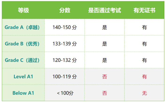 • 获得 B 级或 C 级(剑桥英语量表120-139分)的考生将获得 A2 级别的证书。