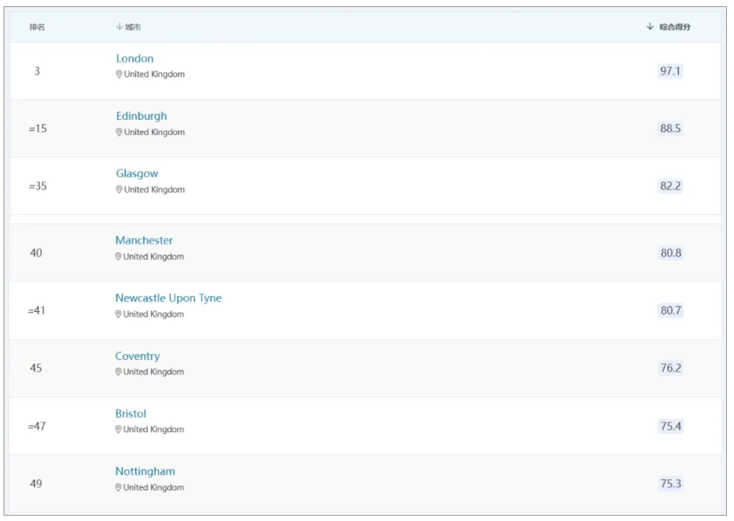 本次上榜TOP50的英国城市包括:伦敦、爱丁堡、格拉斯哥、曼彻斯特、纽卡斯尔、考文垂、布里斯托、诺丁汉。其中伦敦位居世界第三名!