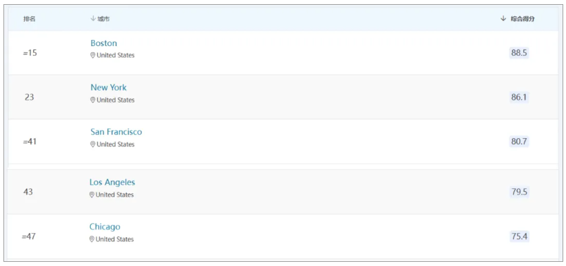 本次上榜TOP50的美国城市包括:波士顿、纽约、旧金山、洛杉矶和芝加哥。