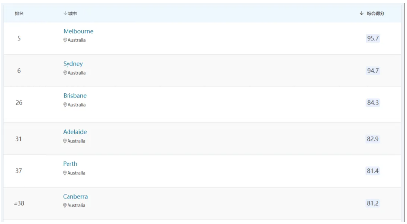本次上榜TOP50的澳大利亚城市包括:墨尔本、悉尼、布里斯班、阿德莱德、珀斯、堪培拉。