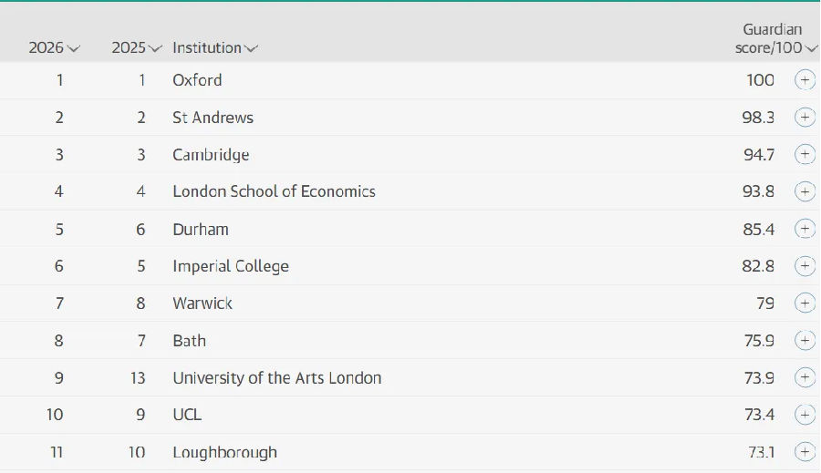 一年一度,英国权威综合日报《卫报》(The Guardian)近日公布了最新2026大学排名。