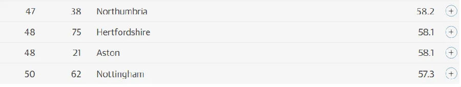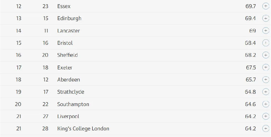 老牌名校也都还在榜上有名:杜伦大学重回Top5,UCL稳居前10。华威大学第7,巴斯大学第8。布里斯托大学、谢菲尔德大学、爱丁堡大学也都稳居前20。
