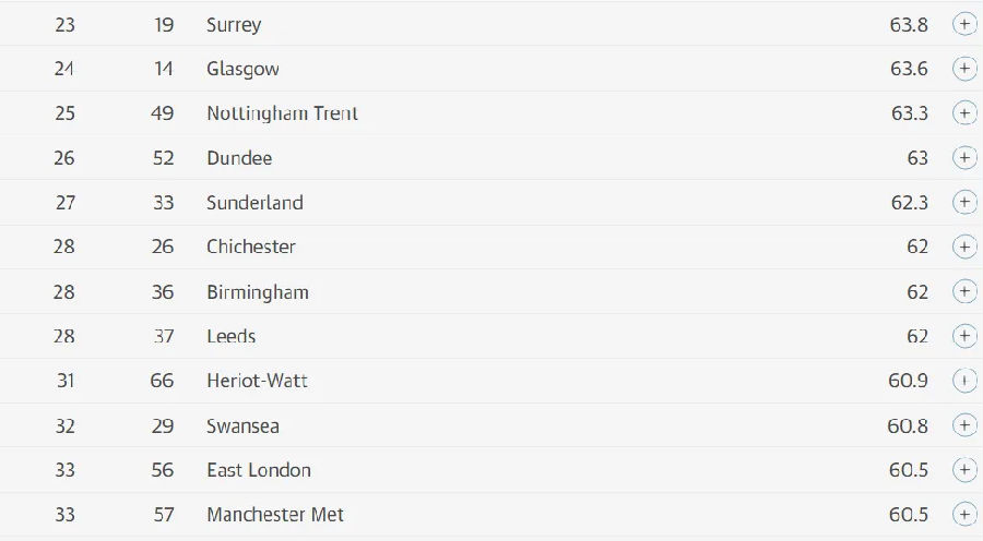 但真正炸场的是——埃塞克斯大学。去年还在第23,今年直接飞升到第12,妥妥黑马!伦艺(UAL)也很猛,前进4名,杀进前十,直接排在第9。