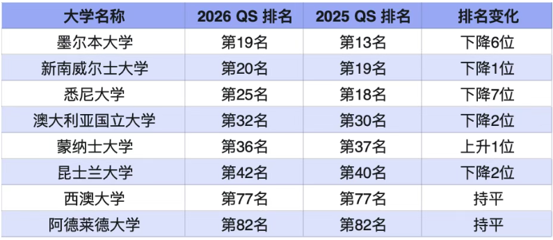 在2026QS世界大学排名中,澳洲有九所院校进入QS前100名。其中,有6所学校上榜TOP50,2所跻身TOP20!另外,悉尼科技大学已连续三年跻身前100,位于第96名