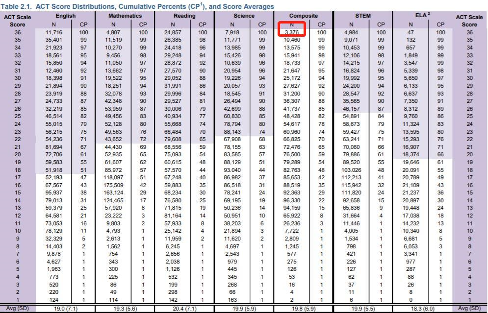 从成绩分布表来看,Mathematics,Science是比较难获得高分的部分,对中国学生也是一样。总分满分36的考生只有3376人,如果ACT考了31分就超过了95%的考生。而31分对应的SAT分数是1400分,而1400分只超过了92%的考生,从这里也可以看出SAT高分考生更多一些。