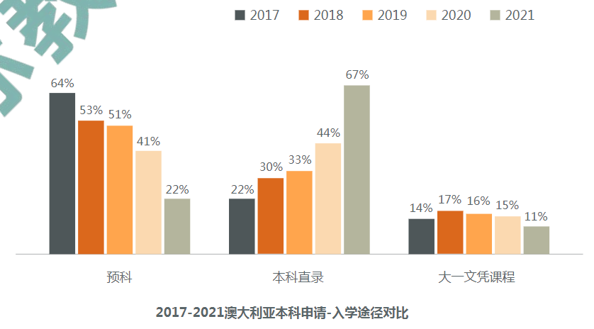 从历年数据中可以看出,近两年通过预科渠道前往澳洲入读本科的学生逐年减少,直录数据较往年有大幅增长,这主要是由于疫情影响,澳洲国境随时会有封闭的政策出现,因此部分学生选择使用高考成绩申请,使得直录比例持续上升。此外,澳洲高校对采用中国高考成绩进入本科的学生的招收政策相对宽松,因而越来越多的优秀高考生选择以本科直录的方式入学,这也是直录比例不断上升的一个因素。