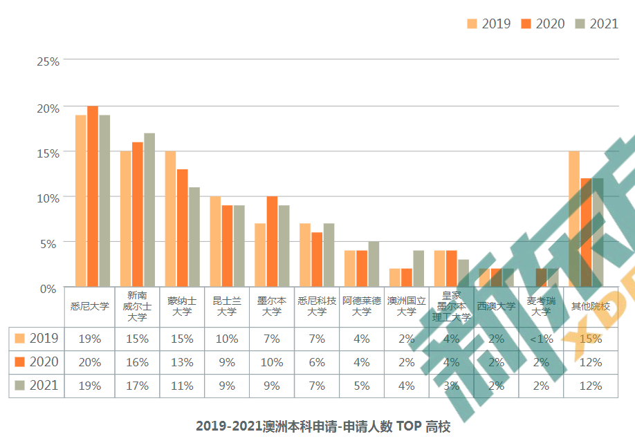 根据前途出国申请数据,2021年申请排名前三的院校是悉尼大学、新南威尔士大学和蒙纳士大学。澳洲国立大学虽是全澳排名第一的大学,因其地理位置偏僻,并且对留学申请人审核严格,采用择优录取的原则,因此虽然占比有些许增幅,申请学生总人数仍然较低。墨尔本大学在澳洲排名第二,但其审理周期较长,澳洲八大其他院校的本科审理周期在4-6周,而墨尔本大学一般需要8周以上,部分学生希望尽快拿到录取通知书,这也是墨尔本大学申请人数较低的重要原因。