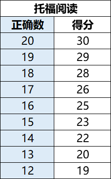 新东方集团的托福老师,按照题目正确率换算出了一份新版考试的阅读算分表(非官方公布,仅供参考学习)。从表格中不难看出,容错率变低且单题分值有所增加,所以对于做题总是粗心马虎的同学会更不友好,每次考试的分数波动有可能会更大。对于想要阅读冲30或者29分的同学,准确度要求会更高。