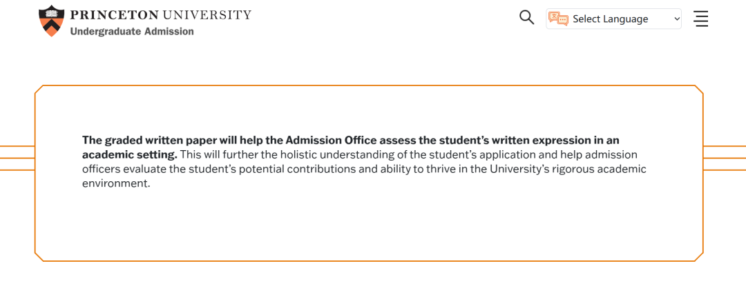 普林斯顿大学非常看重学生的英语学术写作能力。所以除了补充文书的要求,普林斯顿大学都会有一个Graded Written Paper。