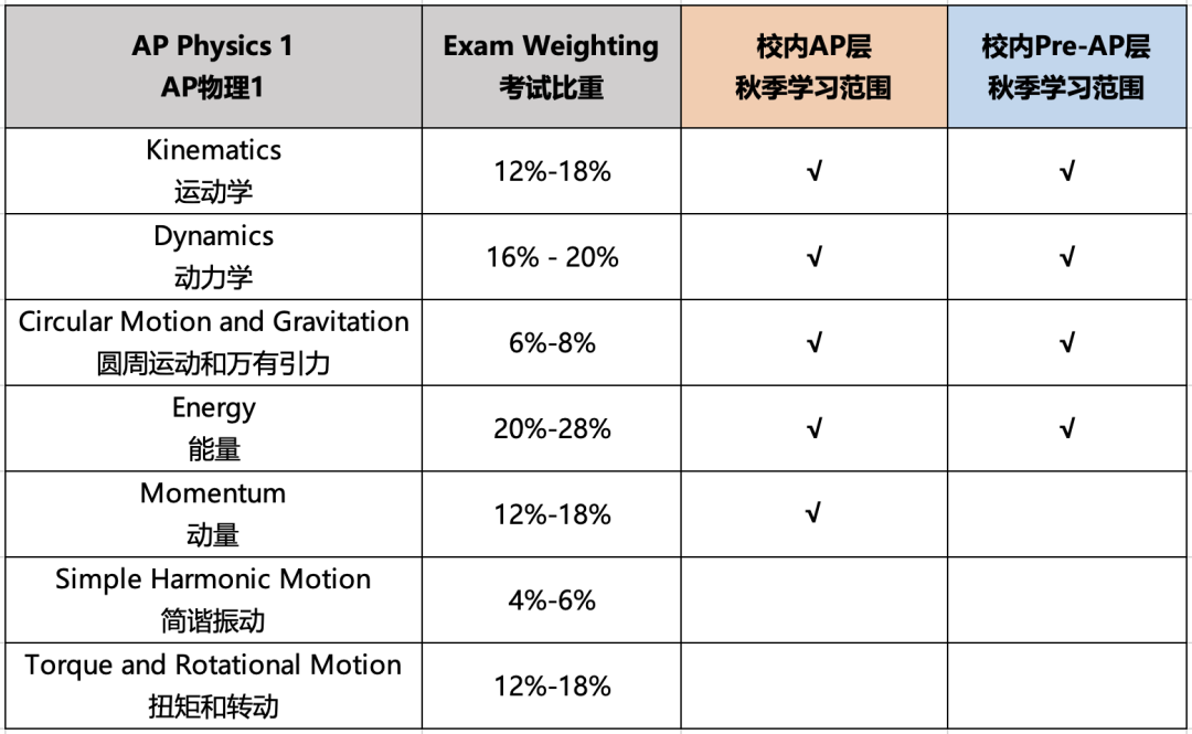 高一校内刚起步学习的物理课,跟物理1的考纲范围最为接近。AP物理1共7章,校内AP层在秋季一般学习前5章,进度更快一些,占 AP考纲知识点的60%左右(其中,学到「能量和动量」难度会大幅提升,在AP考试比重也很高)。校内Pre-AP层秋季一般学习前4章,学习进度更慢、题目练习难度也更低,秋季学期的内容无法触达很多AP考纲重难点章节。