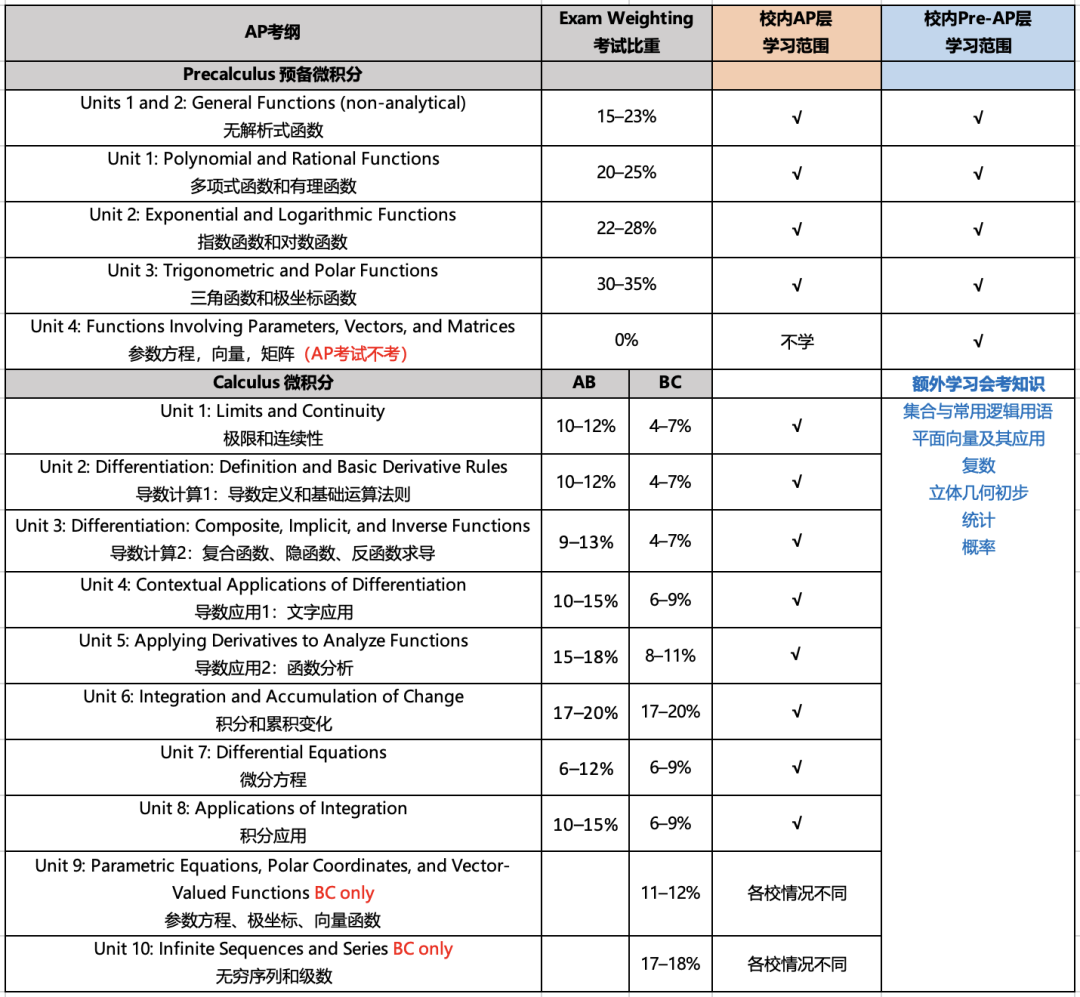 高一各校校内数学课学习起点相同,都是从Pre开始,但是AP层和Pre层的学习进度不同,高一学年中后段路径会分叉。AP层大概用2-3个月学完Pre,之后进入微积分学习,具体学完AB还是BC取决于各校自己的情况。Pre层则会用更长的时间学习预备微积分,一些学校会补充学习会考的额外内容。