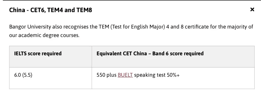 班戈大学接受六级成绩申请大部分课程。主课程需要雅思6分,小分5.5等同于英语六级550 +。还需要参加班戈大学的口语测试,要求50%以上。