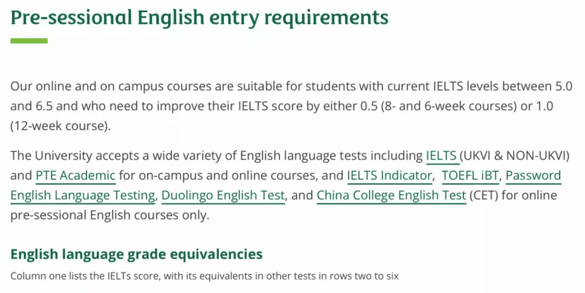 同时学校也可接受托福IBT,Duolingo,Pearson PTE,Cambridge B1/B2/C1,以及Trinity ISE I, II, III 英语成绩申请语言班课程。