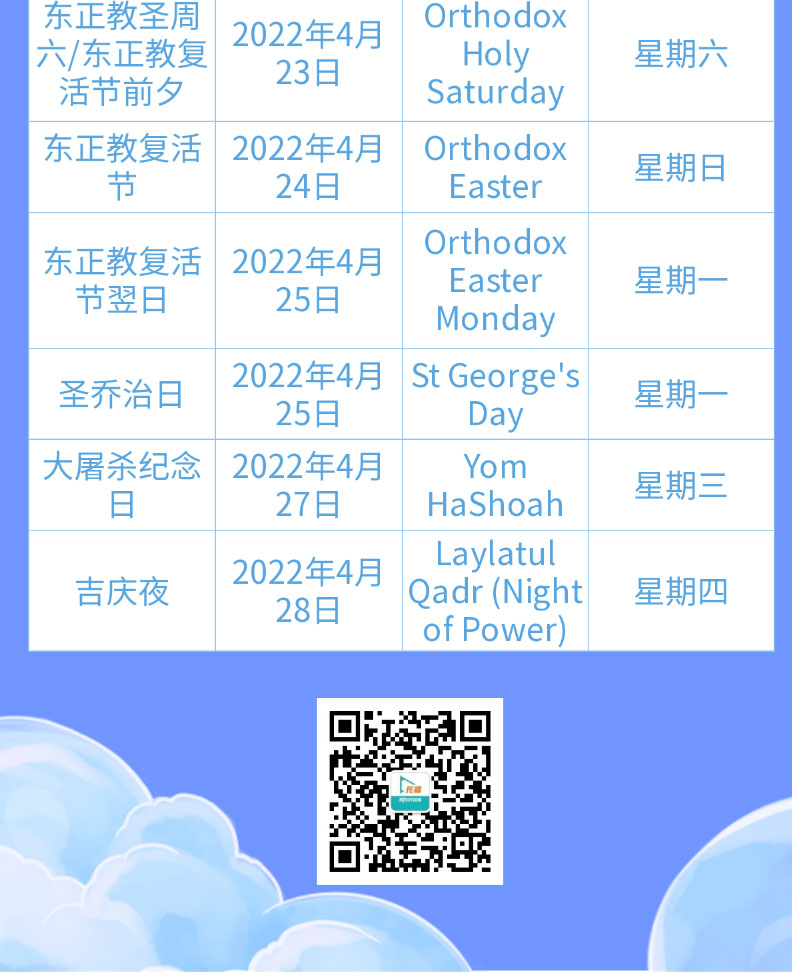 | 复活节 | 2022年4月17日 | Orthodox Easter Day | 星期日 |