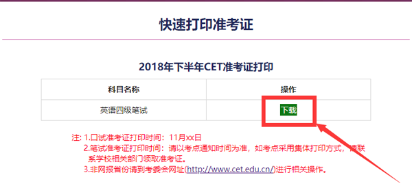 3、下载英语四级准考证并打印(以2018年下半年为例)