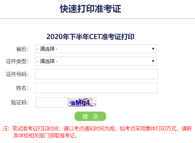 2022年上半年英语六级准考证打印官网入口:以考试所在学校通知为准,采用个人打印方式领取准考证的考生,请于学校通知的开始打印时间后登录网站(http://cet-bm.neea.edu.cn/),用报名时的用户名和密码进入个人账户中打印,也可直接点击主页面中“快速打印准考证”进行打印。