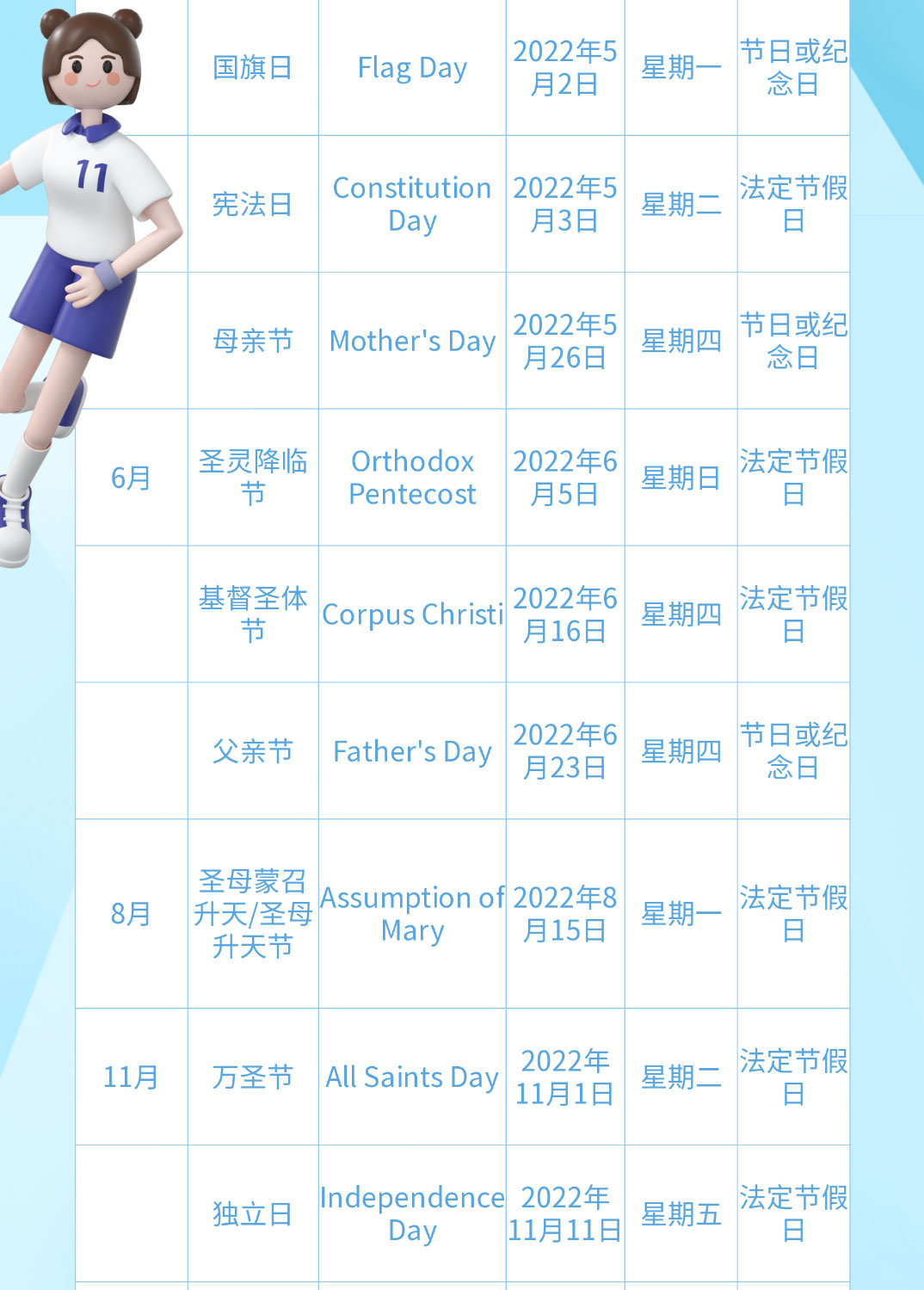 | 6月 | 圣灵降临节 | Orthodox Pentecost | 2022年6月5日 | 星期日 | 法定节假日 |