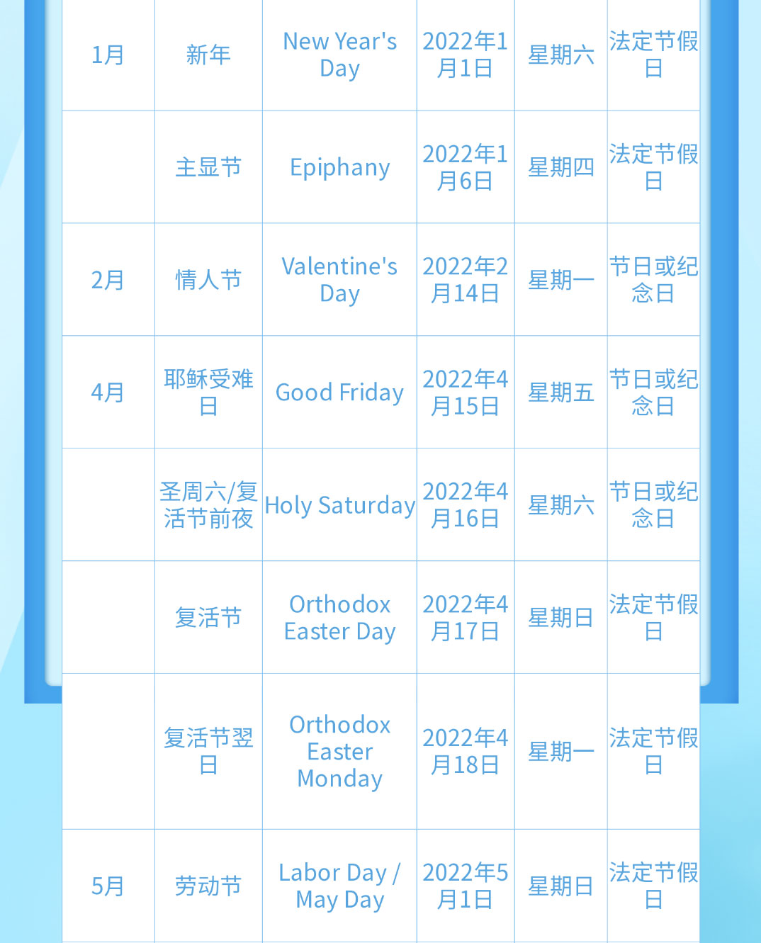 | 复活节 | Orthodox Easter Day | 2022年4月17日 | 星期日 | 法定节假日 | |