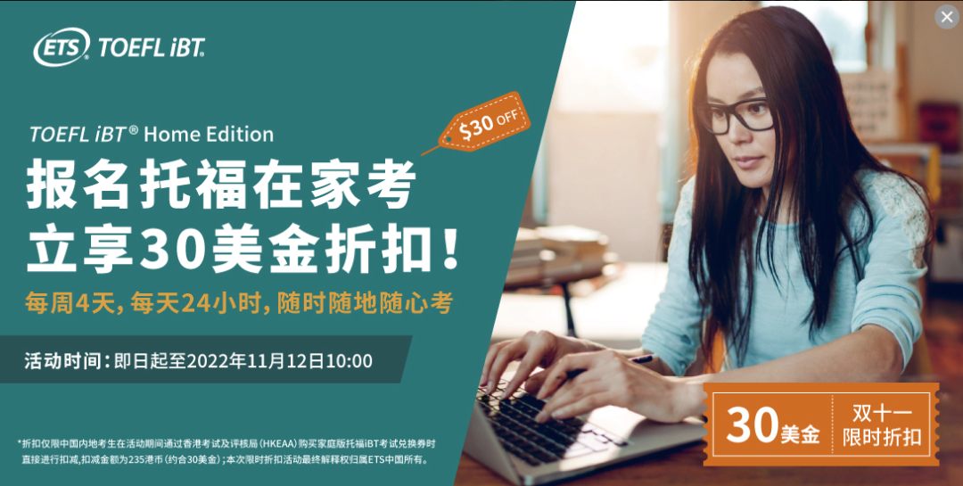 2022年10月12日起至2022年11月12日10:00 ,中国内地考生通过香港考试及评核局(HKEAA)官方网站订购家庭版托福 iBT® 考试兑换券,即享235港币(约合30美元)限时折扣!30美元限时折扣!