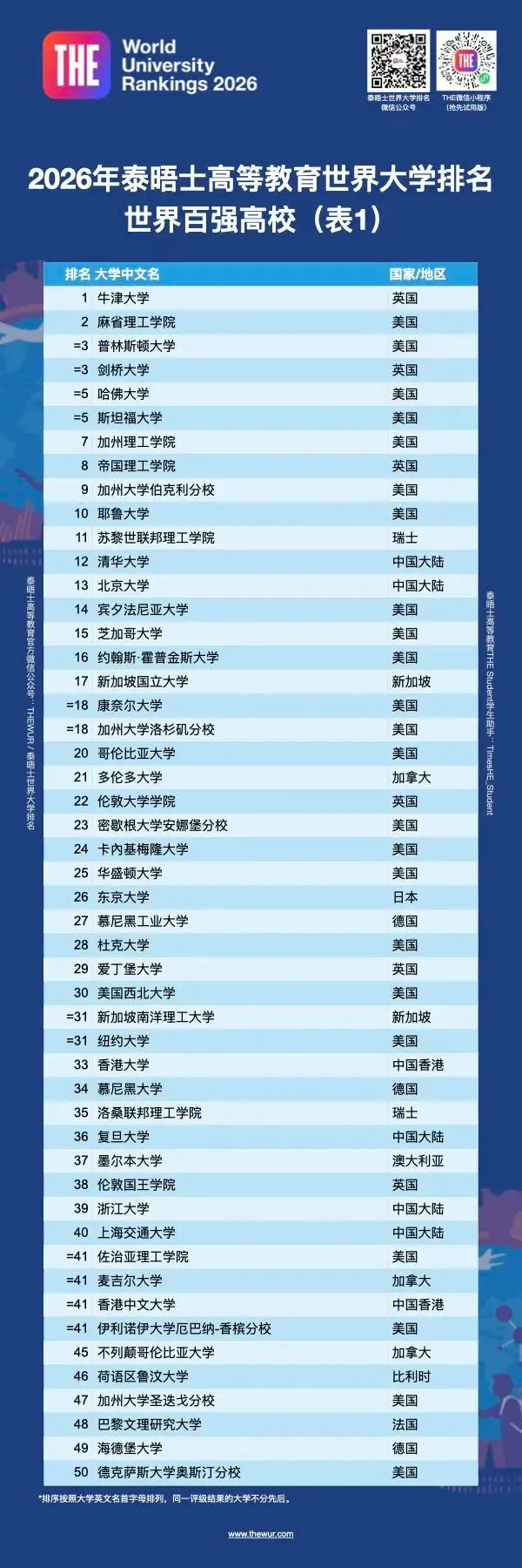 刚刚,泰晤士高等教育(THE)2026年世界大学排名新鲜出炉!